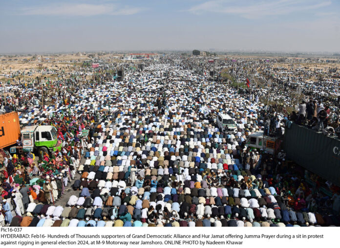 A large number of people gathered in Jamshoro for a sit-in against alleged rigging in the general elections on Friday.