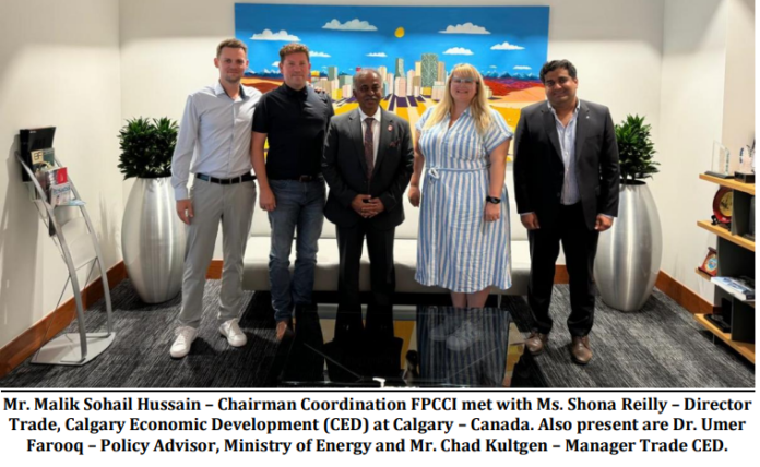 Calgary, Canada :Malik Sohail Hussain, Chairman Coordination of the Federation of Pakistan Chambers of Commerce & Industry (FPCCI), held a significant meeting with Calgary Economic Development (CED) on Thursday, July 18, 2024. The meeting, led by Ms. Shona Reilly, Director Trade at CED, aimed to explore and enhance economic ties between Pakistan and Canada. Green Pakistan Initiative: Malik highlighted opportunities for Canadian businesses in renewable energy and green technology projects under the Green Pakistan Initiative. Tourism Sector: Pakistan’s cultural heritage & landscapes were presented as prime attractions for Canadian tourists and investors, with opportunities in hotels, resorts, and travel services mainly Trekking in Himalayan Range. Mines and Minerals: Mr. Malik invited Canadian companies to explore investment in Pakistan’s rich mineral resources, including coal, gold, and copper. Security and Stability: Addressing security concerns, Malik Sohail introduced the Special Investment Facilitation Council (SIFC), ensuring a secure environment for investors. Pink Salt and Rice: He briefed that there is a lot of potential which can be explored with export of Pink Salt and Basmati rice.