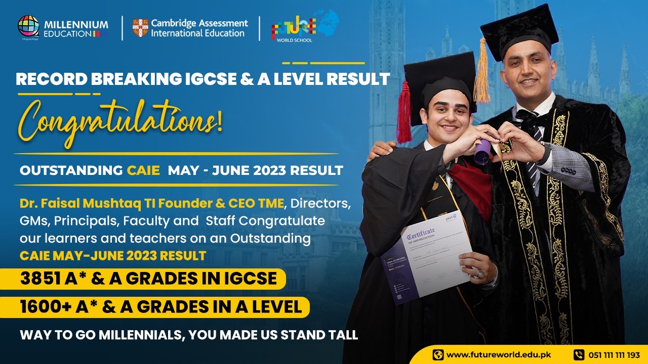The CAIE examination result 2023 speaks volume about the A Level and IGCSE programs offered at The Millennium Education Group and Future World Schools & Colleges. The Millennium Education Group cultivates critical thinking, real-life application, and innovative ideas, preparing learners to thrive in the 21st century. Throughout their academic journey, learners are empowered with the mindset and skillset essential for success.