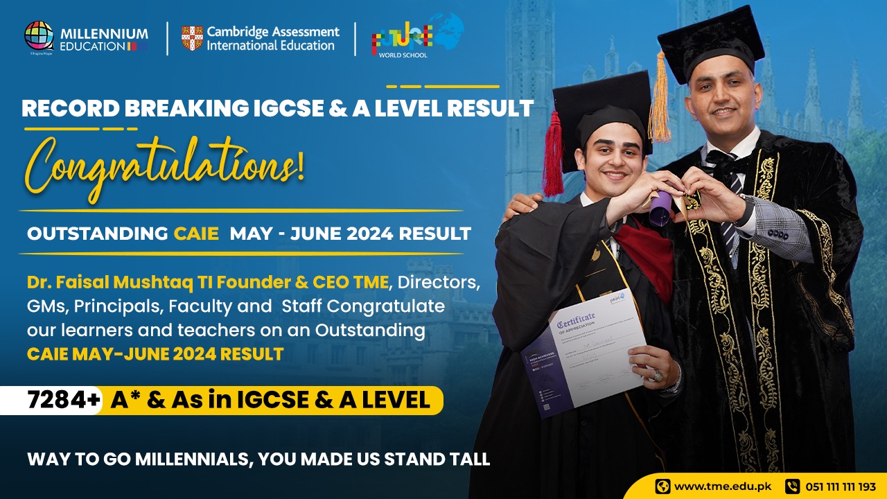 ISLAMABAD: Continuing a legacy of excellence, Roots Millennium Education Group and Future World Schools & Colleges achieved remarkable academic success in the Cambridge Assessment International Education CAIE Examinations 2024 says a press release. This resounding achievement stands as a testament to Roots Millennium Education 36-year journey of academic excellence and quality education. Millennials, with their exceptional performance and persistent hard work, have once again secured remarkable results in the IGCSE and A Level May – June 2024 Series, scoring over 7284 A*s and As. This achievement not only adds another accolade to The Millennium Education repertoire but also showcases the unwavering commitment of the school community and teaching fraternity to effective teaching and learning. Dr. Faisal Mushtaq TI, CEO of The Millennium Education Group, congratulated all the learners on these significant achievements and urged them to continue pushing boundaries for a brighter future. He emphasized that dedication and learning yield excellent outcomes, affirming our stance as one of Pakistan’s best private schools & colleges, committed to holistic growth. These remarkable IGCSE and A Level result are indicative of our learners’ readiness for Higher Education. He also expressed his gratitude to all the parental community for their continuous support and to the teaching faculty for their dedicated efforts. Mrs. Erum Atif, Director Teaching and Learning at The Millennium Education Group extended her heartfelt congratulations to young talented learners. She highlighted the transformative power of education, stating, “School is not just a place to earn good grades; it’s a realm where the journey of self-discovery and personal growth unfolds.” She underlined that examinations are not the culmination but a steppingstone for our learners, propelling them forward on a path to embrace greater challenges and assume greater responsibilities. Moreover, she commended the learners for their dedication and diligence, acknowledging that their commitment is a testament to their aspirations for excellence. She encouraged them to carry the torch of curiosity and knowledge forward, reminding them that every experience in their educational journey shapes them into well-rounded individuals ready to make meaningful contributions to society. The CAIE examination result 2024 speaks volume about the A Level and IGCSE programs offered at The Millennium Education Group and Future World Schools & Colleges. The Millennium Education Group cultivates critical thinking, real-life application, and innovative ideas, preparing learners to thrive in the 21st century. Throughout their academic journey, learners are empowered with the mindset and skillset essential for success. As true trailblazers, The Millennium Education Group extends heartfelt congratulations and best wishes to all the learners, teaching faculty, and parental community for their future endeavours.