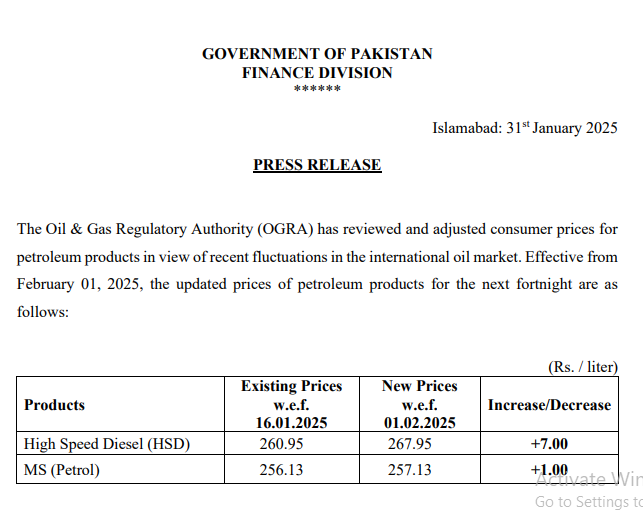 High Speed Diesel (HSD) increased by Rs 7.00 per liter to Rs:267.95