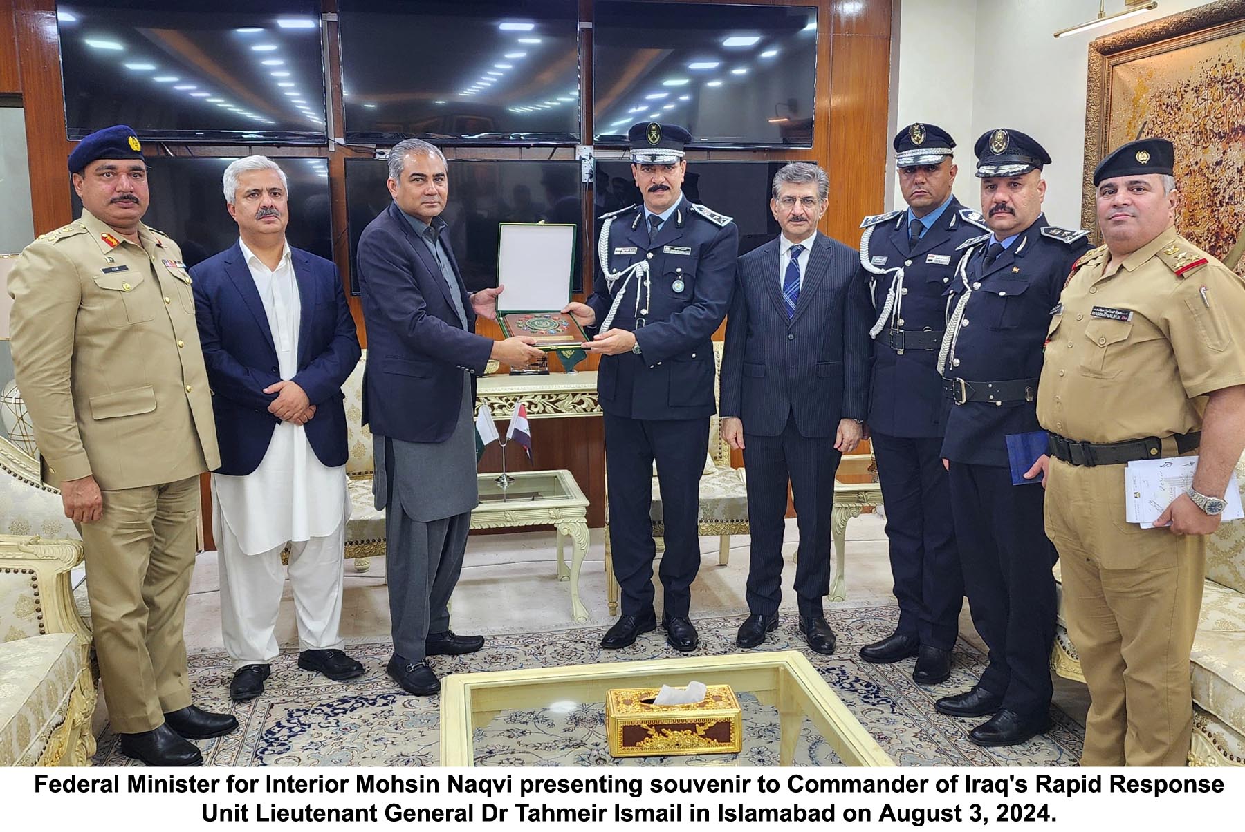 ISLAMABAD: Minister for Interior Mohsin Naqvi met with a high-level Iraqi delegation led by Commander of Iraq’s Rapid Response Unit Lieutenant General Dr. Tahmeir Ismail here on Saturday.