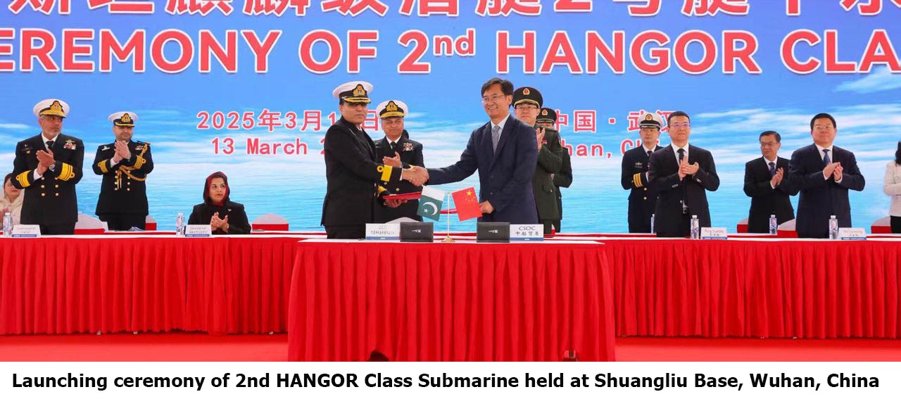 Islamabad :The launching ceremony of the second Hangor Class submarine, PNS/M SHUSHUK (Desig), was held at Wuchang Shipbuilding Industry Group Company Ltd, Shuangliu Base, Wuhan, China. Vice Chief of the Naval Staff, Vice Admiral Ovais Ahmed Bilgrami, graced the occasion as the Chief Guest.