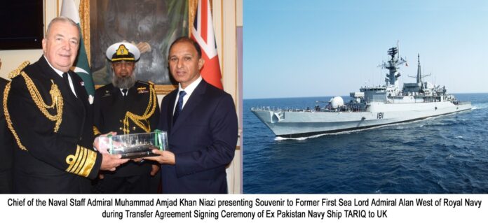 Islamabad :The Transfer Agreement Signing Ceremony for the ex-Pakistan Navy Ship TARIQ to Falls of Clyde International (FOCI) of United Kingdom was organized at Pakistan High Commission in London. Chief of the Naval Staff Admiral Muhammad Amjad Khan Niazi graced the ceremony as Chief Guest. Former First Sea Lord and Chief of the Naval Staff Royal British Navy, Admiral Lord Alan West attended the ceremony as Guest of Honour. Ex PNS TARIQ was formerly decommissioned by Pakistan Navy on 4 Aug 23 and has been gifted by the Government of Pakistan to a UK based firm Falls of Clyde International (FOCI) that plans to convert the ship into a floating museum. The ship will be on static display at Clyde Maritime Heritage Centre in Glasgow as a symbol of common naval heritage of the Royal and Pakistan navies.