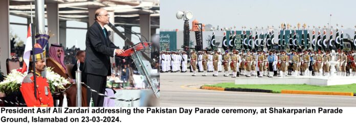 President Saudi Defence Minister Prince Khalid bin Salman Al Saud, who previously served as an F-15 pilot in Royal Saudi Air Force, was the guest of honour of the ceremony. In his address, President Zardari said that the Pakistani nation and armed forces were always ready to respond to any aggression at all times. “Today’s parade is a reminder of our unity, strength, and pride,” said the president who earlier reviewed the parade after arriving at the venue escorted in his chariot by the presidential guards mounted on horses. Pakistan not to compromise its sovereignty, tolerate any destabilizing efforts: President The president congratulated the nation on the Day which commemorated the historic struggle of the Muslims of the subcontinent to achieve a separate homeland under the leadership of Quaid-e-Azam Muhammad Ali Jinnah. He also paid tribute to the martyrs and Ghazis with a resolve to make all-out efforts to protect national security and sovereignty. The president’s address encompassed domestic subjects like recent elections, efforts against terrorism, economic challenges, and the establishment of SIFC, and the regional situation including the human rights abuses in Indian Illegally