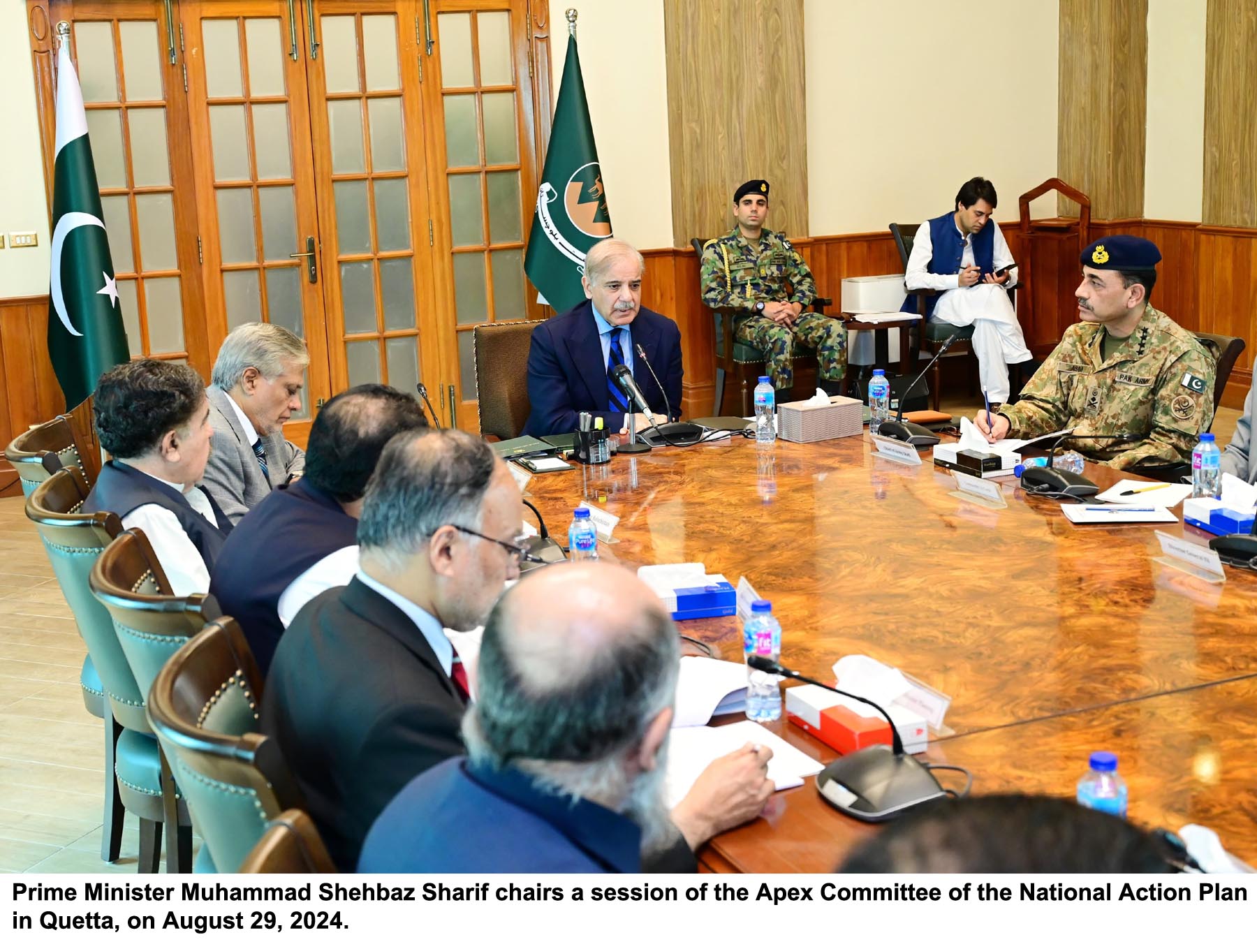 The premier was on a day-long visit to the city. Chief of Army Staff General Asim Munir, Deputy Prime Minister Ishaq Dar, Balochistan Governor Sheikh Jaffar Khan Mandokhail, Chief Minister Sarfraz Bugti, Interior Minister Mohsin Naqvi, Planning Minister Ahsan Iqbal, Information Minister Attaullah Tarar, Commerce Minister Jam Kamal, the provincial corps commander, and other armed and civilian officials attended the meeting.