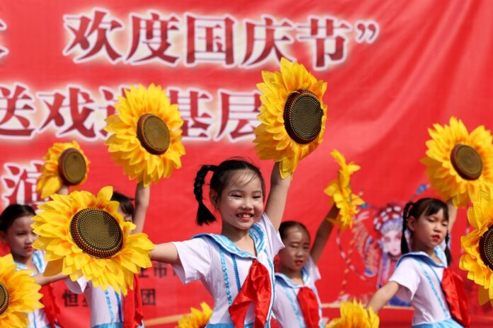 Children dance to celebrate the National Day in Zaozhuang City, east China's Shandong Province, Octo/Xinhua