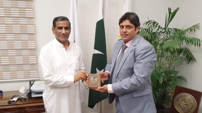 According to the details, Secretary General of Pakistan Hockey Federation Haider Hussain met Secretary General of Pakistan Olympic Association Khalid Mahmood in his office. On this occasion, POA Secretary General Khalid Mahmood congratulated PHF Secretary General Haider Hussain on being elected as Secretary General PHF. Affiliation letter for the 4-year constitutional term (2022-26) of the officials elected in the Pakistan Hockey Federation elections was also presented by the Pakistan Olympic Association. As per the affiliation letter issued by POA, Brig. (R) Khalid Sajjad Khokhar President PHF, Syed Haider Hussain Secretary General PHF, ShahidParvezBhandara as Treasurer PHF will be part of the affiliated unit of POA. During the meeting of Secretary General PHF Haider Hussain with Secretary General POA Khalid Mahmood, there was a detailed discussion about international events. On this occasion, Secretary General POA Khalid Mahmood said that hockey is not only our national game but also the flagship of national sports. There are high expectations from our national sport of hockey and its newly elected officials.