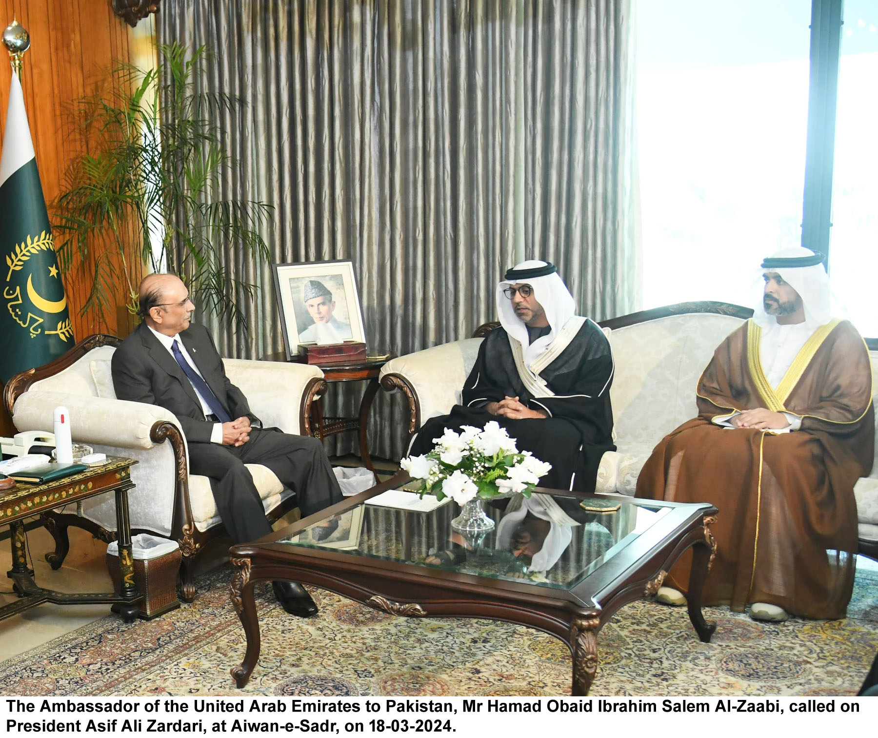ISLAMABAD: President Asif Ali Zardari on Monday emphasised the need for further boosting of bilateral ties between Pakistan and the United Arab Emirates (UAE) in the areas of trade, economy, aviation, renewable energy, climate change and human resource development for the mutual benefit of the two brotherly countries. The president expressed these views while talking to Ambassador of UAE to Pakistan Hamad Obaid Ibrahim Salem Al-Zaabi, who called on him, at Aiwan-e-Sadr, President Secretariat Press Wing said in a press release.