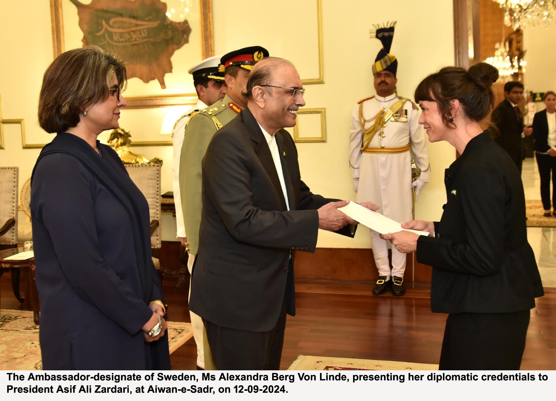 During the meeting with Ambassador Alexandra Berg Von Linde, President Zardari said that Pakistan and Sweden enjoyed friendly and cooperative relations based on mutual respect and understanding. He underlined the need to further strengthen the bilateral relations for the mutual benefit of the two countries.