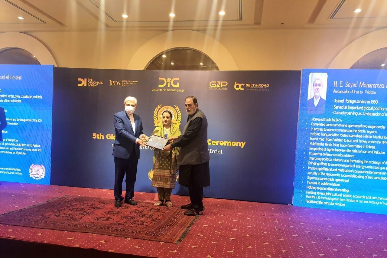 ISLAMABAD: Seyed Mohammad Ali Hosseini, Ambassador of the Islamic Republic of Iran to Pakistan, was selected as the selective Ambassador of the year by the "Diplomatic Insight" on the occasion of the 75th anniversary of the establishment of relations between the two neighboring countries. He was awarded the 2022 Global Ambassador Award for his efforts to promote Iran-Pakistan relations. Spokesman photo by Ghulam Farid