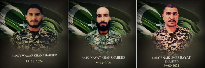 However, during intense exchange of fire, three brave sons of soil; Naik Inayat Khan (age: 36 years, resident of District Khyber), Lance Naik Umer Hayat (age: 35 years, resident of District Mansehra) and Sepoy Waqar Khan (age: 25 years, resident of District Peshawar), having fought gallantly, embraced Shahadat.