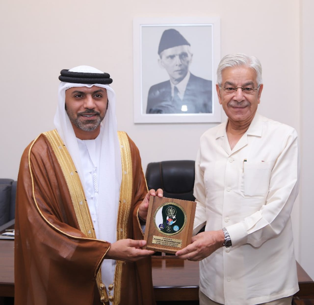 Islamabad: Federal Minister for Defence, Khawaja Muhammad Asif is presenting a shield to H.E Mr. Hamad Obaid Al-Zaabi, Ambassador of UAE at Islamabad Office on 07-06-2022.