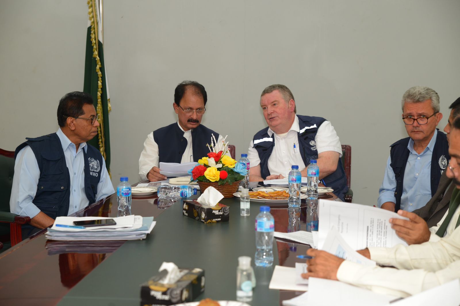 Commissioner Sukkur Division Ghulam Mustafa while briefing the WHO delegation, said that in Sukkur Division overall, 2.56 million individuals were directly affected by floods, losing their homes and crops. However, water is still standing in the fields and many villages and union councils, stranded in water where the government machinery has been unable to reach. He said that the Provincial Disaster Management Authority (PDMA) is coordinating the relief effort while deputy commissioners are focal persons for the emergency relief and recovery operations. He welcomed the WHO delegation and requested immediate supplies of medicines, health facilities, and defogging machine to avert spread of malaria and dengue and to cater to pregnant women.