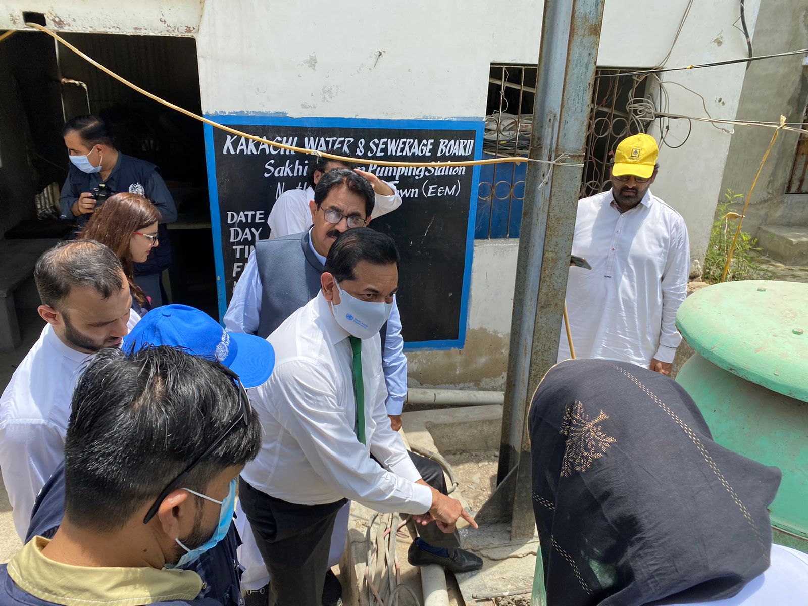 Islamabad: WHO Pakistan Representative Dr.Palitha Mahipala accompanied by DHO Central (Karachi) visited the Sakhi Hassan pumping station and spoke to the community regarding its water use. Water samples were collected by WHO team for testing. Dr. Mahipala asked the team to share water testing results urgently and encouraged the DHO Central team to collect water samples frequently for testing. WHO is providing reagents for testing water quality and aqua tabs for water purification.